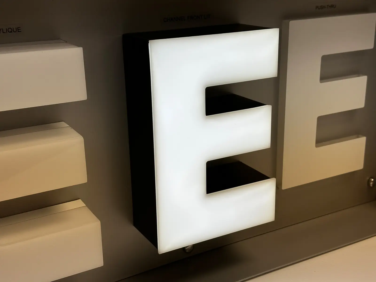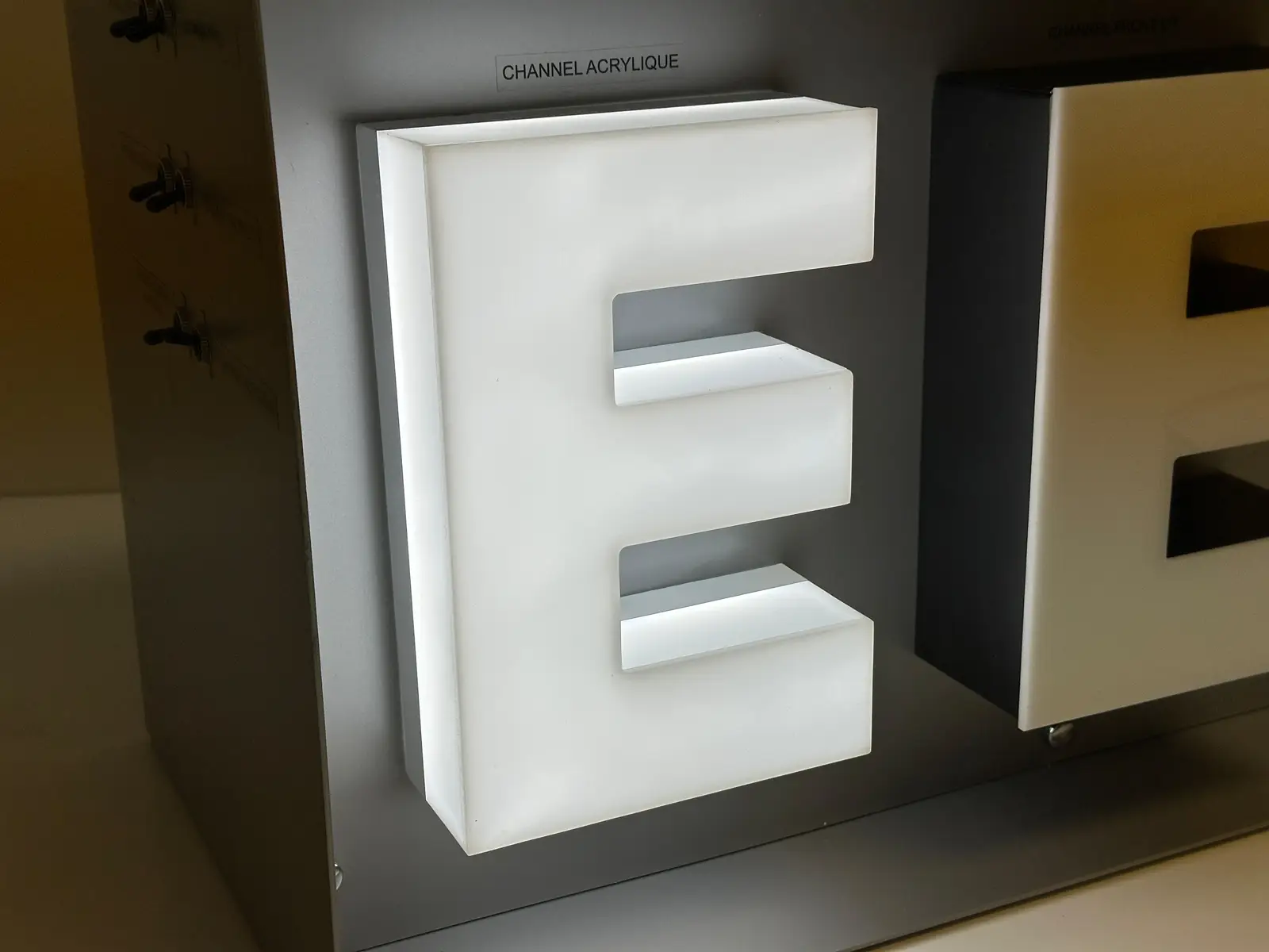 Ces lettres profilées conçues en acrylique offrent une apparence unique grâce à leur éclairage en surface ainsi que sur les côtés. Leur conception leur permet de s’intégrer parfaitement dans des décors modernes et stylisés, avec des options d’éclairage pour une meilleure visibilité.