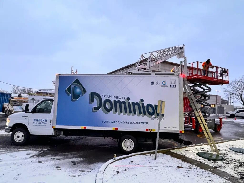 Depuis 1950, le Groupe Enseignes Dominion a acquis une expertise de pointe dans l’installation des enseignes, de la signalétique et des solutions numériques. De l’installation de notre premier projet à aujourd’hui, nous avons perfectionné nos processus pour offrir à nos clients des installations sûres, rapides et conformes aux normes de sécurité les plus strictes.